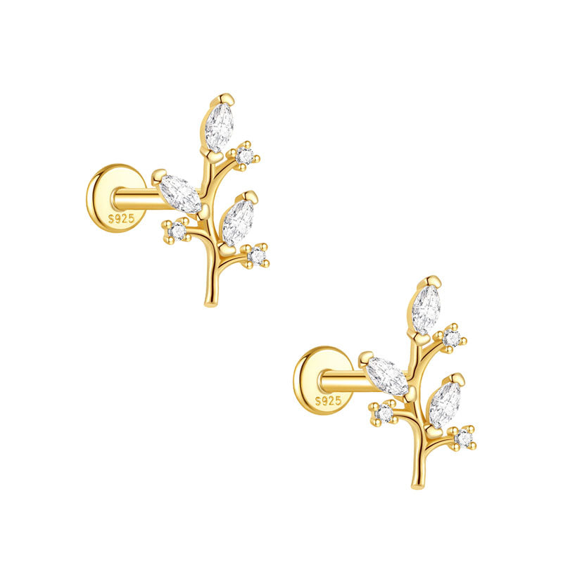 Discover timeless elegance with these zircon leaf branch flat back earrings, expertly crafted from S925 sterling silver and finished with warm gold plating. Each piece features sparkling cubic zirconia stones that catch the light beautifully, adding sophisticated sparkle to your collection. The nature-inspired leaf and branch design offers a contemporary twist on classic botanical jewelry. Ideal for cartilage piercings or standard lobes, the secure flat back mechanism provides stability and comfort for extended wear. A refined choice for those seeking jewelry that balances natural beauty with modern craftsmanship.