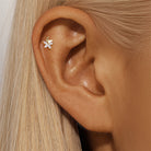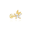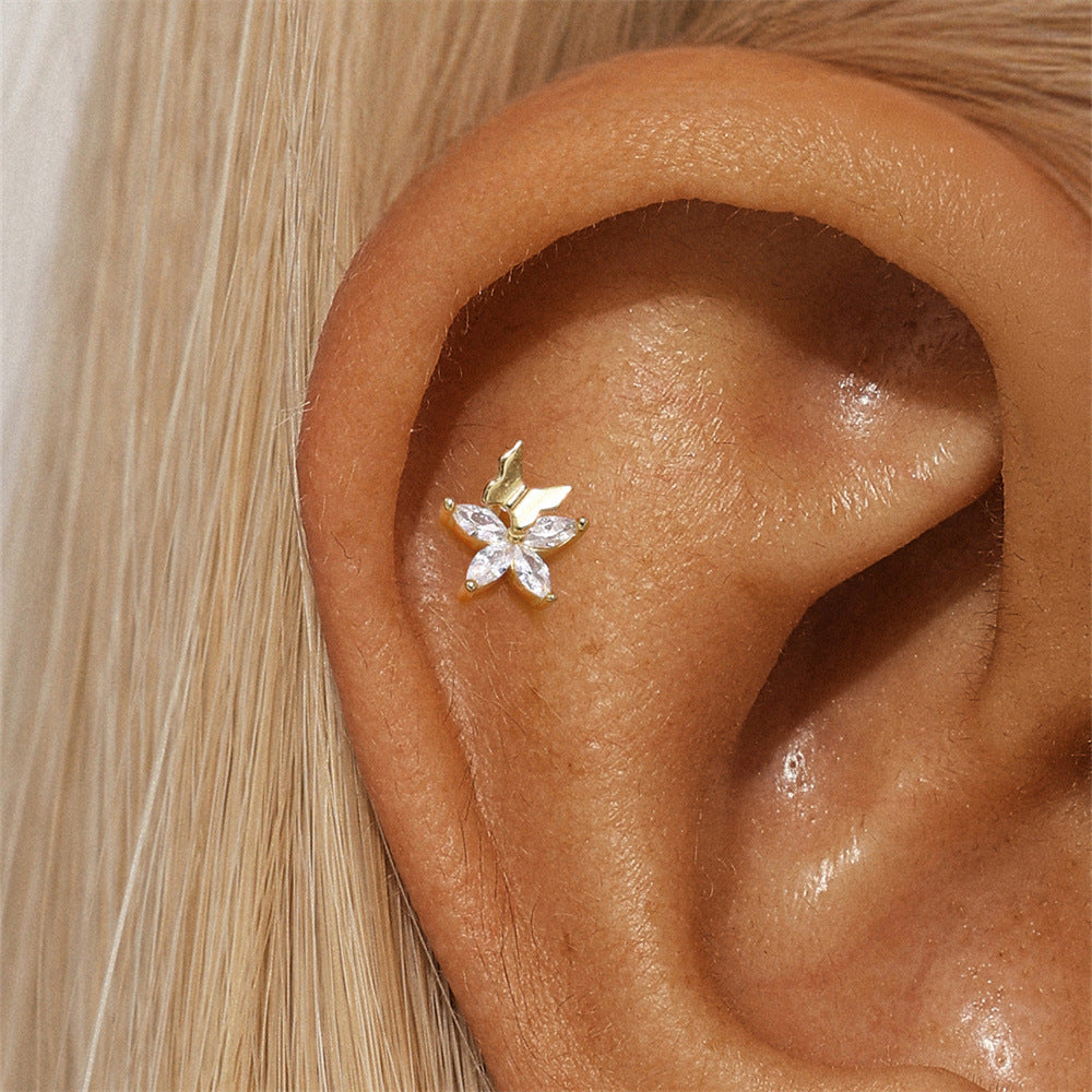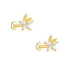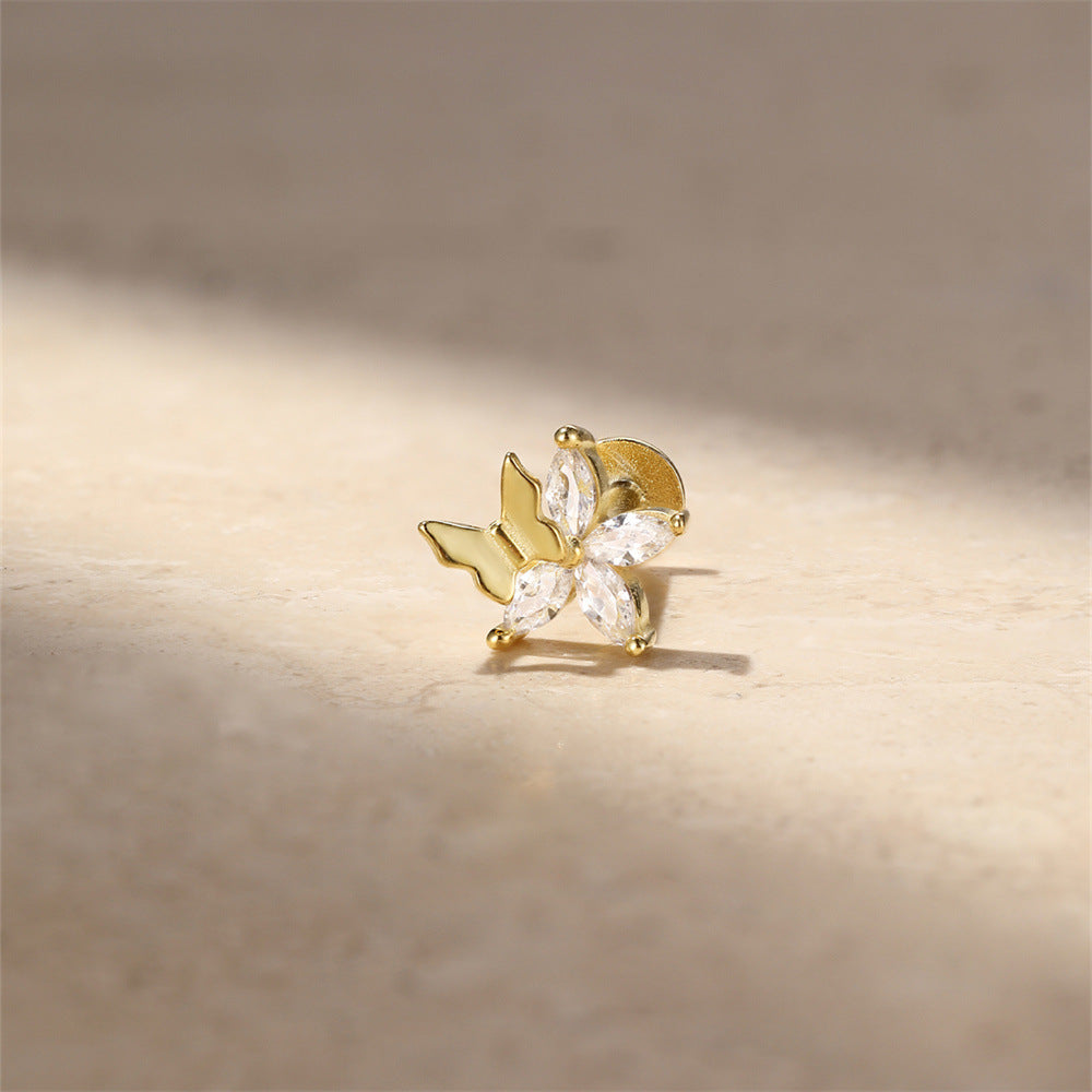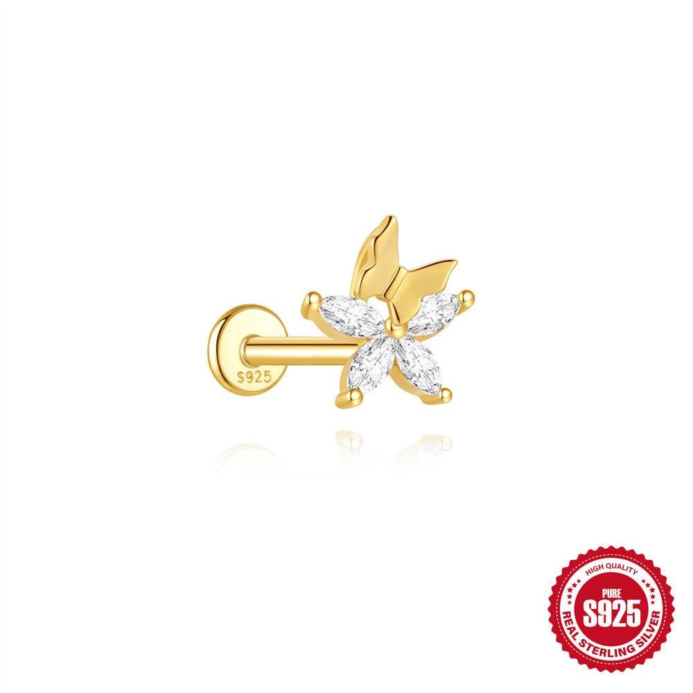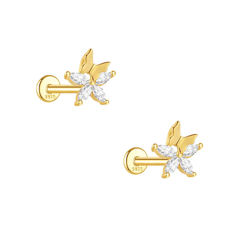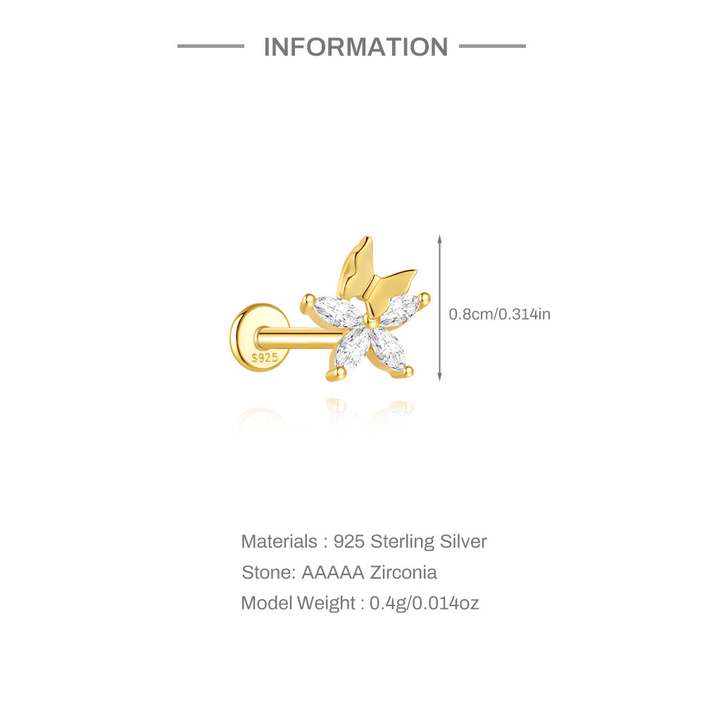 Butterfly & Zircon Flower Flat Back Earrings 925 Sterling Silver Gold Plated Cartilage Jewelry