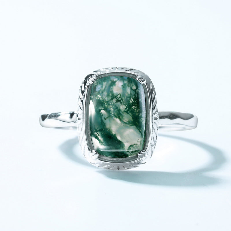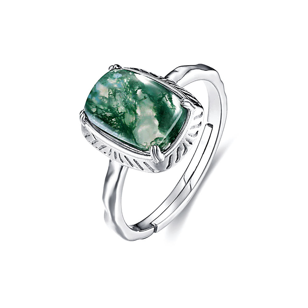 Präsentieren Sie Ihre Persönlichkeit mit diesem einzigartigen Moos-Achat-Ring. Dieser mit natürlichem Moos agat eingelegte Verlobung sring aus Sterling silber repräsentiert die verflossene Ewigkeit der Liebe-bis zum Tod. Einzigartig und lebendig, vermittelt jeder natürliche Moos agat Vitalität und schöne Liebe. Für das Leben verflochten, wie Fluss pflanzen, dauert ihre Bindung bis zum Ende der Zeit. Mit seinen auffälligen Schattierungen besticht der Wasser gras Achat vor allem die Frauen.