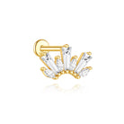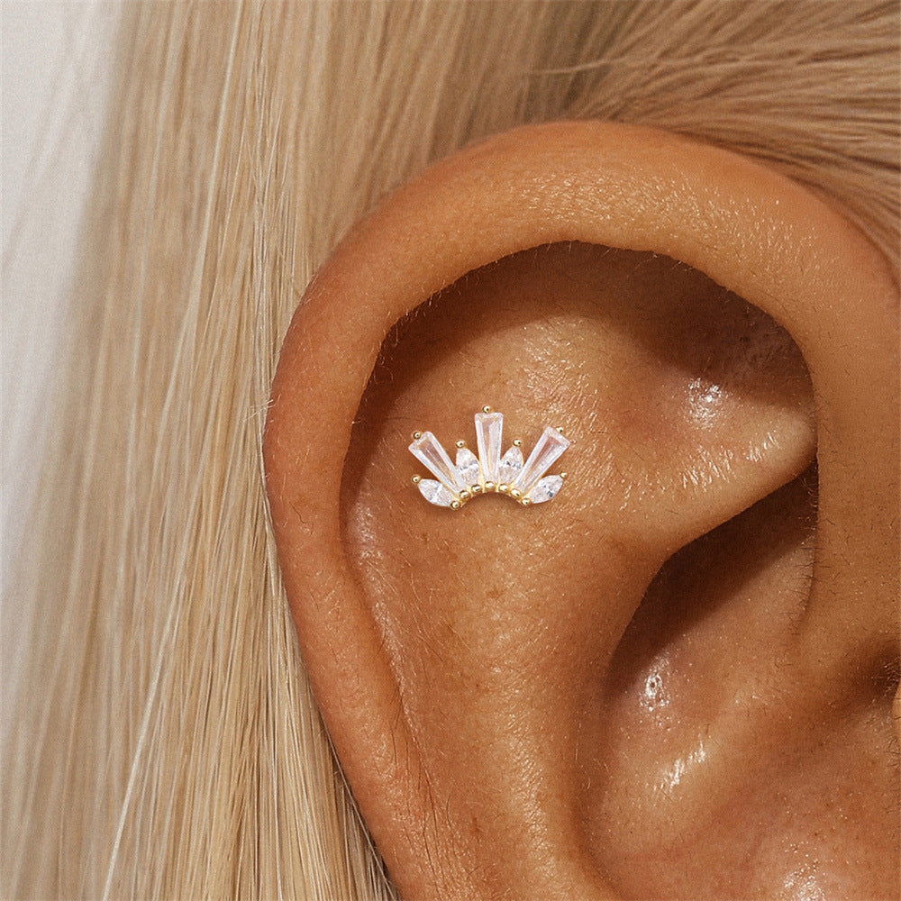 Elevate your cartilage piercing with these sophisticated fan-shaped earrings, crafted from 925 sterling silver with luxurious gold plating. Each piece features brilliant cubic zirconia stones that catch the light beautifully, delivering sparkle without the premium price tag. The flat back design ensures comfortable, secure wear throughout the day, making these versatile studs perfect for both everyday elegance and special occasions. Ideal for those seeking refined minimalist jewelry that doesn't compromise on style or quality.