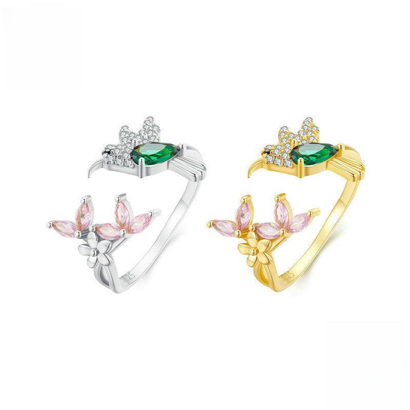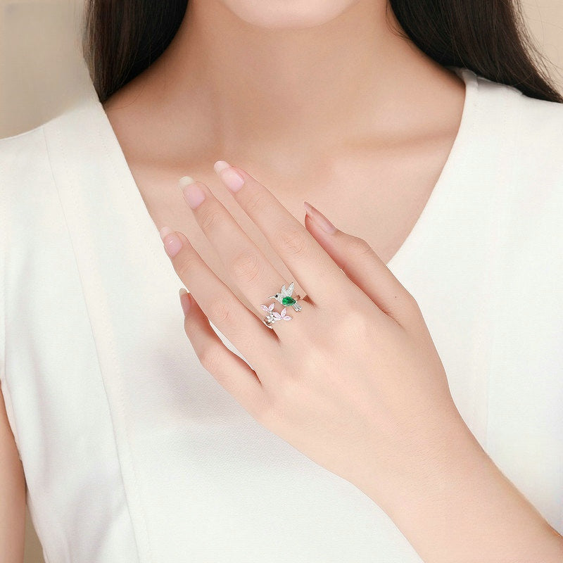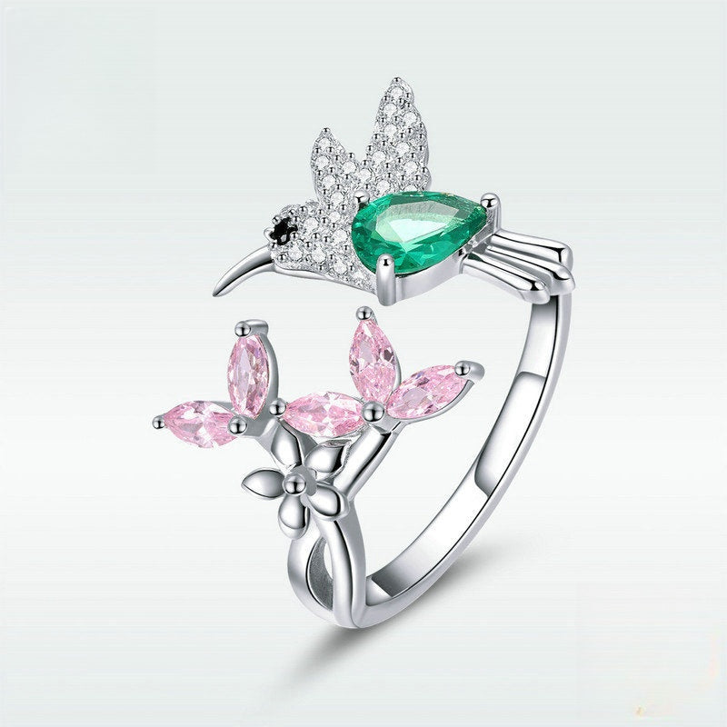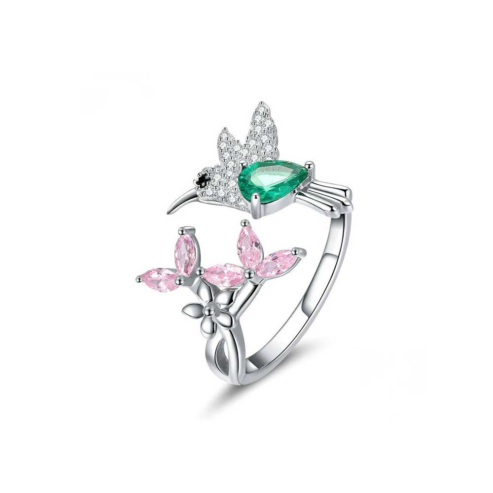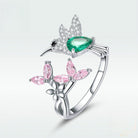 Sterling Silver Simulated Emerald Hummingbird Pink FlowerToi et Moi Ring