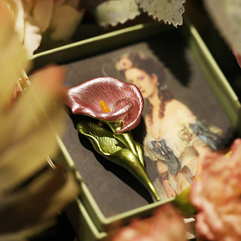 This elegant copper calla lily brooch is perfect for adding a touch of sophistication to any outfit. Its intricate design and warm coloring make it a versatile accessory for both casual and formal occasions. Made with high-quality materials, this brooch is sure to become a staple in your jewelry collection.