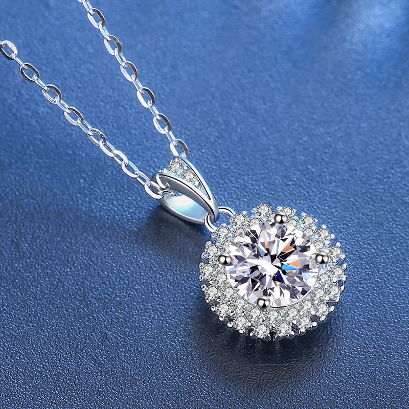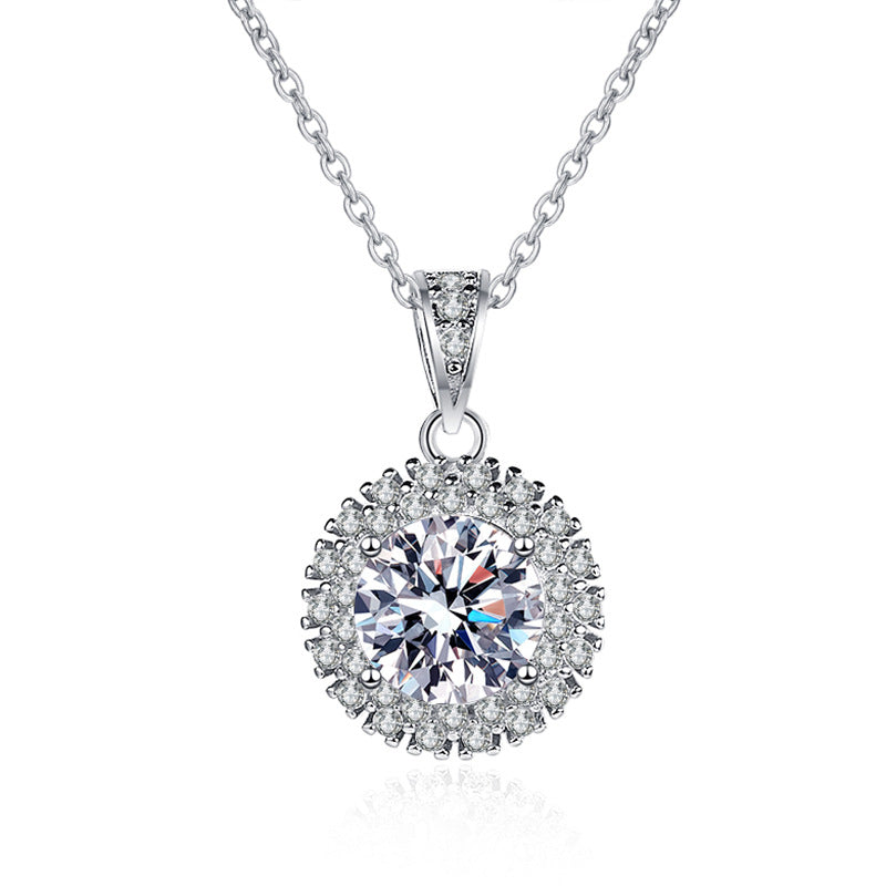 이 해바라기 심플 패션 Moissanite 목걸이는 독특한 꽃 무늬의 8 개의 작은 돌로 둘러싸인 7mm 둥근 컷 Moissanite 센터를 특징으로하는 멋진 해바라기 디자인을 활용합니다. 18K 화이트 골드로 제작 된이 아름다운 목걸이는 기억에 남는 진술을 할 것입니다.