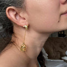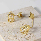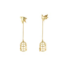 Each earring features a golden bird, poised as if in the moment of escape from an open cage that dangles elegantly from a thin chain. The design captures a moment of liberation, where the bird has just exited the cage, symbolizing freedom and the endless possibilities that come with unconditional love.