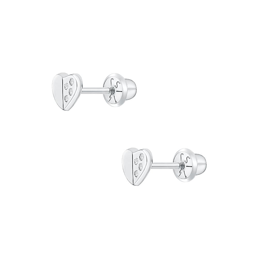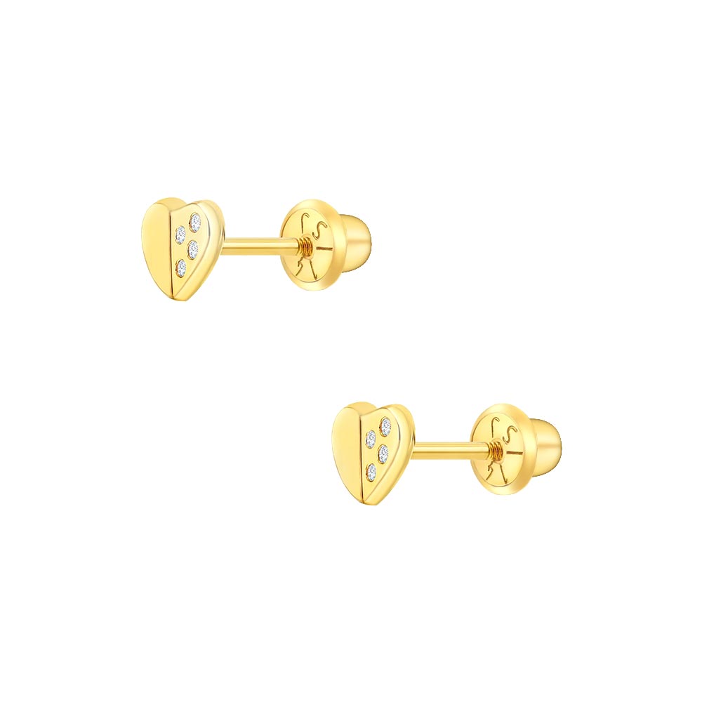 These finely crafted heart-shaped earrings are sure enough to brighten up your little girl's day. A pair of 14k yellow gold screw-back earrings that can fit securely in your little girl's ears without causing discomfort. These beautiful heart earrings feature dainty clear cubic zirconia stones throughout one side to add more glimmering details. They are made of 14k yellow gold, a precious material which is suitable for little girls with sensitive ears. Gift box included.